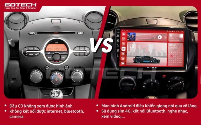 Màn hình ô tô thông minh GOTECH là một sản phẩm thiết kế đẹp mắt, cấu hình cao, tích hợp nhiều tính năng hiện đại hơn các dòng sản phẩm đi trước. Đặc biệt, màn hình ô tô GOTECH là màn hình đầu tiên có điểm G giúp các anh có thể ra lệnh giọng nói dễ dàng chỉ bằng 1 nút chạm. Việc lắp đặt màn hình ô tô GOTECH Mazda 2 đem lại cho người dùng vô vàn lợi ích không thể không kể đến như: