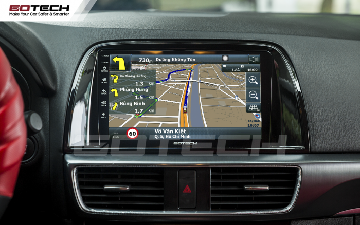 Không chỉ dừng lại ở việc dẫn đường một cách thông minh, tiện lợi, màn hình ô tô Gotech xe Mazda CX5 với các ứng dụng camera hành trình, camera 360, camera lùi, còn có chức năng cảnh báo tốc độ, cảnh báo lấn làn bằng tiếng Việt giúp bạn có thể điều khiển xe một cách chủ động và an toàn trên mọi cung đường. Với màn hình ô tô Gotech, bạn sẽ hoàn toàn yên tâm lái xe trong mọi hành trình của mình.