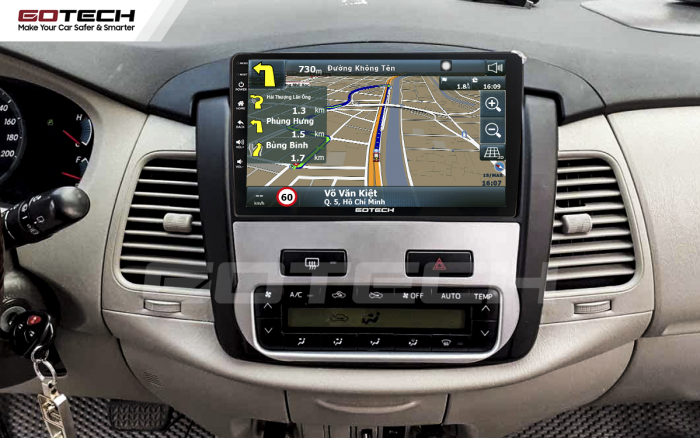 hơn hẳn một chiếc màn hình nguyên bản trên xe Innova, màn hình android ô tô Gotech cho phép bạn cài đặt các ứng dụng chỉ đường thông minh như: Vietmap S1, Navitel và Google maps. Các phần mềm này cực kỳ hữu ích đối với tài xế lái xe dịch vụ bởi nó cung cấp đường đi nhanh nhất, loại bỏ những tuyến đường đông, giúp bạn tiết kiệm thời giạn cũng như chi phí di chuyển. Bên cạnh đó, phần mềm bản quyền Vietmap S1 hay Navitel hỗ trợ cảnh báo bằng giọng nói về tốc độ, giúp bạn lái xe an toàn khi tham gia giao thông.
