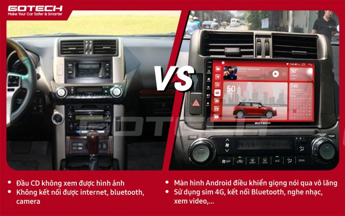 Màn hình ô tô thông minh GOTECH là một sản phẩm thiết kế đẹp mắt, cấu hình cao, tích hợp nhiều tính năng hiện đại hơn hẳn những loại khác. Việc sử dụng các tính năng tương đối dễ dàng, khâu lắp đặt và bảo hành cũng rất nhanh chóng, đơn giản. Dưới đây là hình ảnh cho thấy sự khác biệt khi lắp màn hình GOTECH cho xe Prado 2010-2013, các anh cùng tham khảo nhé!