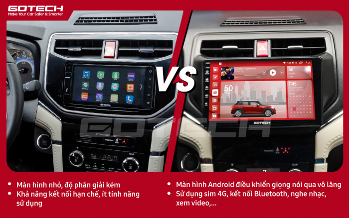 Tuy nhiên, đầu DVD nguyên bản này lại không được hỗ trợ kết nối internet 4G, hạn chế tích hợp các thiết bị ngoại vi, bạn không thể sử dụng các ứng dụng giải trí online cũng như kết nối USB từ các dòng camera hành trình, cảm biến,… Việc nâng cấp một chiếc màn hình android hiện đại như Gotech là một quyết định đúng đắn giúp bạn nâng cao trải nghiệm cũng như nâng tầm đẳng cáp nội thất xe của bạn.